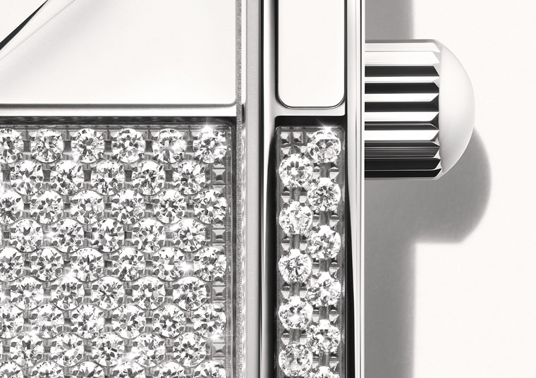 ▲上半部H字型錶殼與上半部面盤上採黑或白漆,而下半部面盤則鑲嵌138顆鑽石,錶圈亦點綴93顆鑽石。