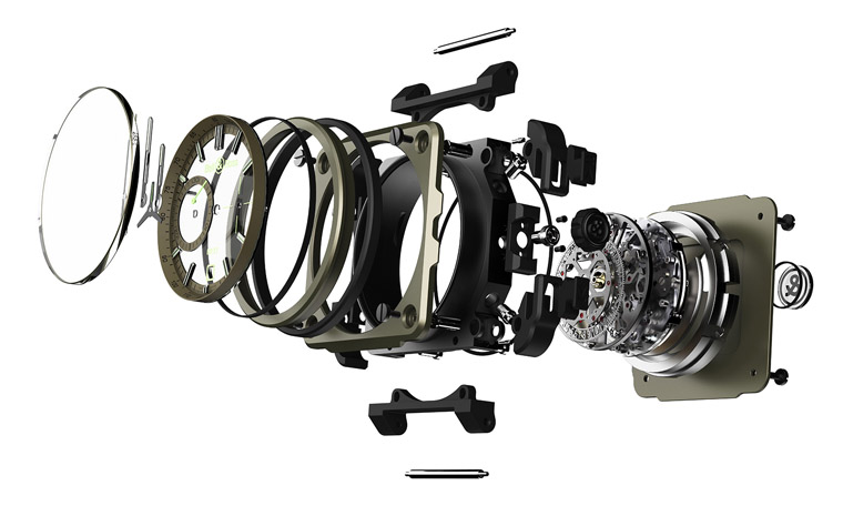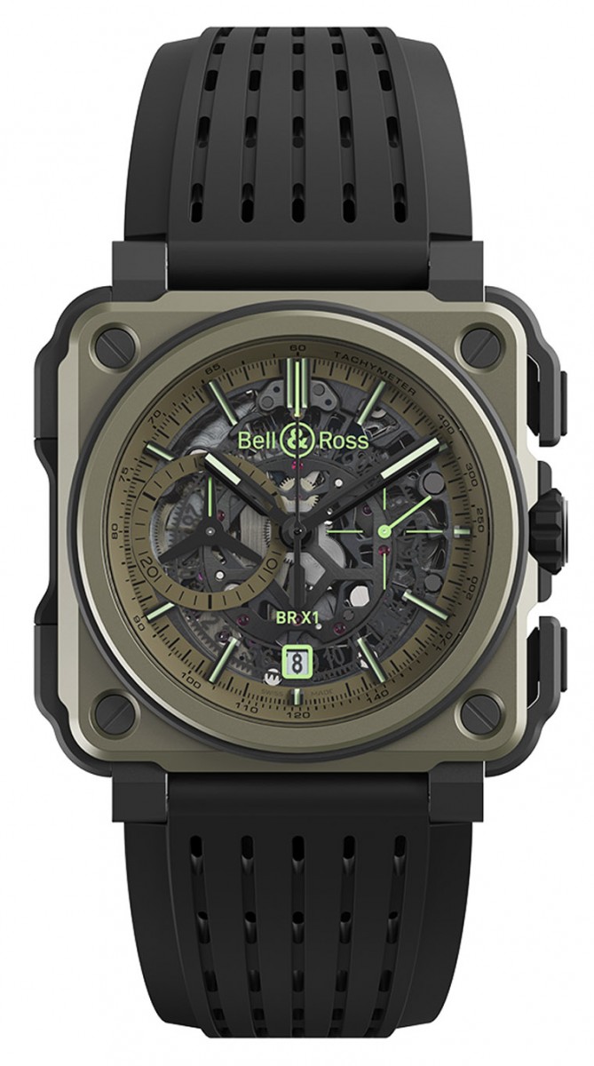 BR-X1 Military採用霧面卡其色耐磨鈦金屬(HRT)錶殼和超亮綠色夜光物料。所謂的HRT是一種超耐磨材料,透過高科技來改造鈦金屬,使其更加耐磨,並賦予其獨特的卡其色。錶殼直徑與其他BR-X1計時錶相同,依舊是45毫米,同時它還搭配黑色陶瓷和橡膠零件。