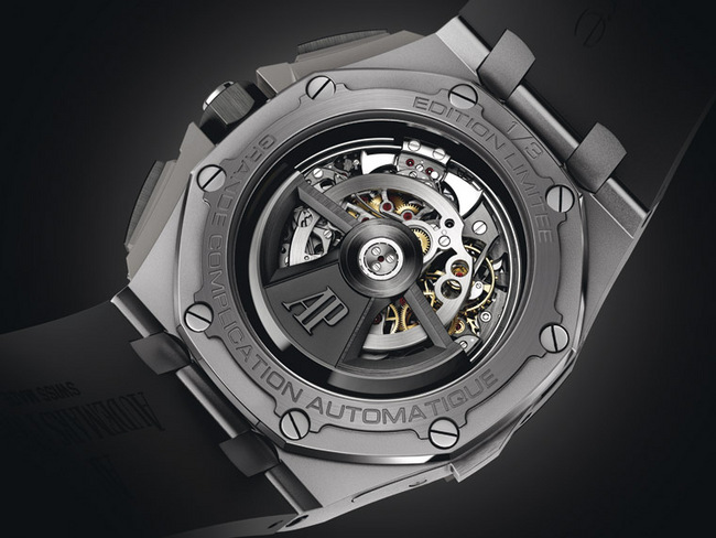 倒角、鑽孔、錐形孔、噴沙等精緻加工工序要求一絲不苟的長時間精細操作,所需成本相當於機芯價格的三分之一。在這些令機芯光彩奪目的技藝中,倒角處理無疑最受稱讚,也是對手工操作要求最嚴格的手工技藝。這種技藝要求製錶師具備數年的豐富經驗,運用銼刀磨平元件的棱角,並使用拋光輪拋光成細微線條來突出光線的折射效果。這種機械裝置的美學加工處理淋漓盡致地展露出細緻入微的手工工藝水準。每個元件均經過仔細精心的加工處理。某些元件,如透過錶底蓋可見的三問報時音錘,就採用了兩種高級複雜的後期加工處理:一種是鏡面拋光,用錶行術語來說,其形成的光滑程度可用「即便是眼神一瞥也會留下刮痕」來形容;另一種是倒角處理,包括內角和外角的倒磨,是藝術家精湛技能的體現。必須指出的是,這些在機械裝置上難於辨識的特殊倒角,是藝術工匠一種秘而不宣的標記和手工製作的標準證明,因為沒有任何機器能夠打造出這種精緻加工效果。這些後期加工處理自古以來便有其實際功能,就是防止灰塵和潮氣侵入機芯。只有工匠完美掌握嫺熟技能,這些精緻加工和裝飾處理才能令冰冷的金屬機械裝置光彩奪目。愛彼製錶師對這些工藝的掌握已達到爐火純青的境界,能夠在品牌產品中運用自如。這款鈦金屬手錶配以黑色陶瓷錶圈、錶冠與按把,且備有玫瑰金材質錶款。這款頂級時計奢華而又充滿運動氣息,玫瑰金款僅發行3枚,搭配白色橡膠錶帶,配以18K玫瑰金錶殼、黑色陶瓷錶圈和白色陶瓷切割的錶冠和按把。
