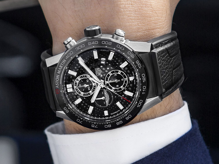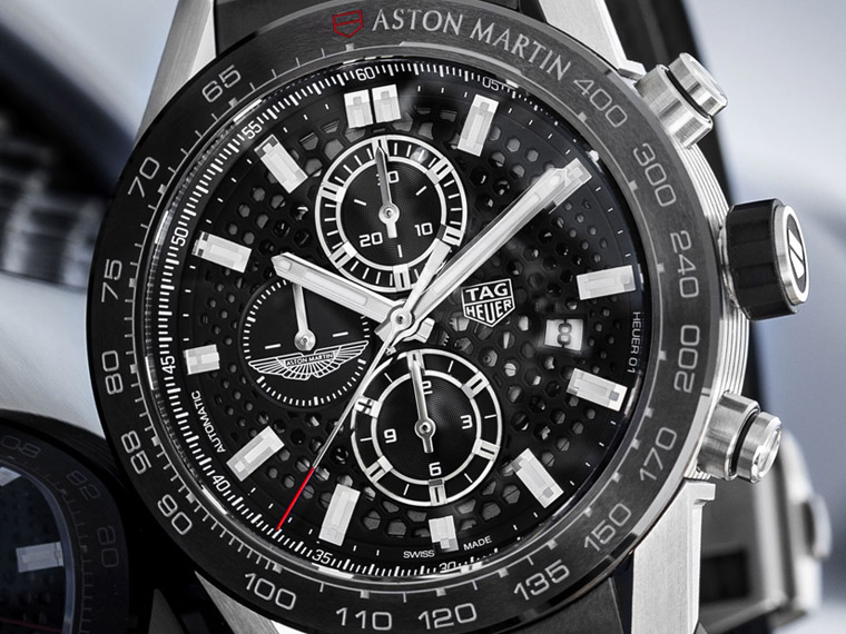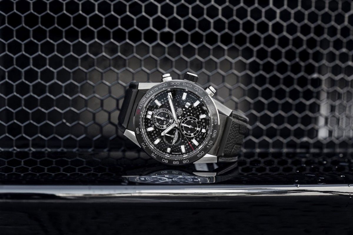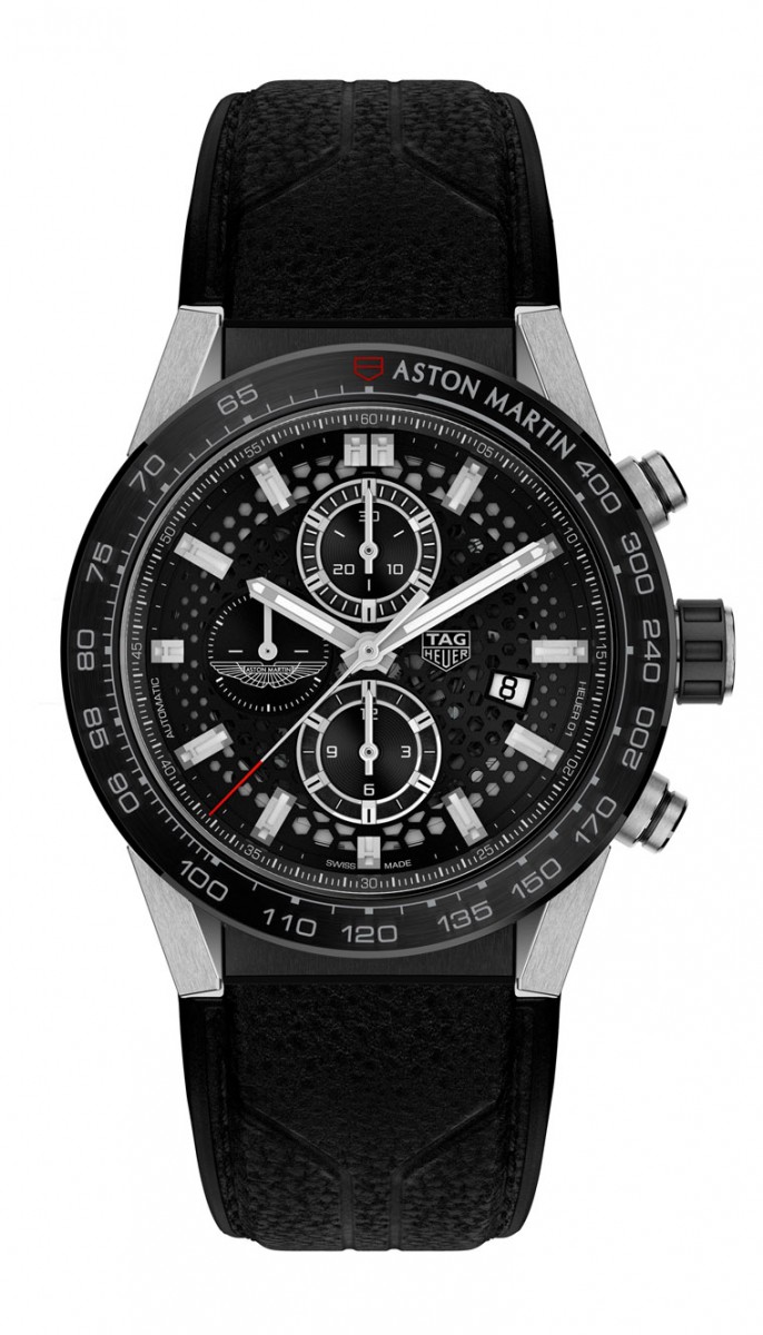▲似曾相識的Heuer-01系列設計,但是套用在ASTON MARTIN特別版身上後旋即出現改用蜂巢狀面盤、9點小錶評添加ASTON MARTIN Logo等細節微調,此外像是錶圈上的測速計文字也改成”ASTON MARTIN”。