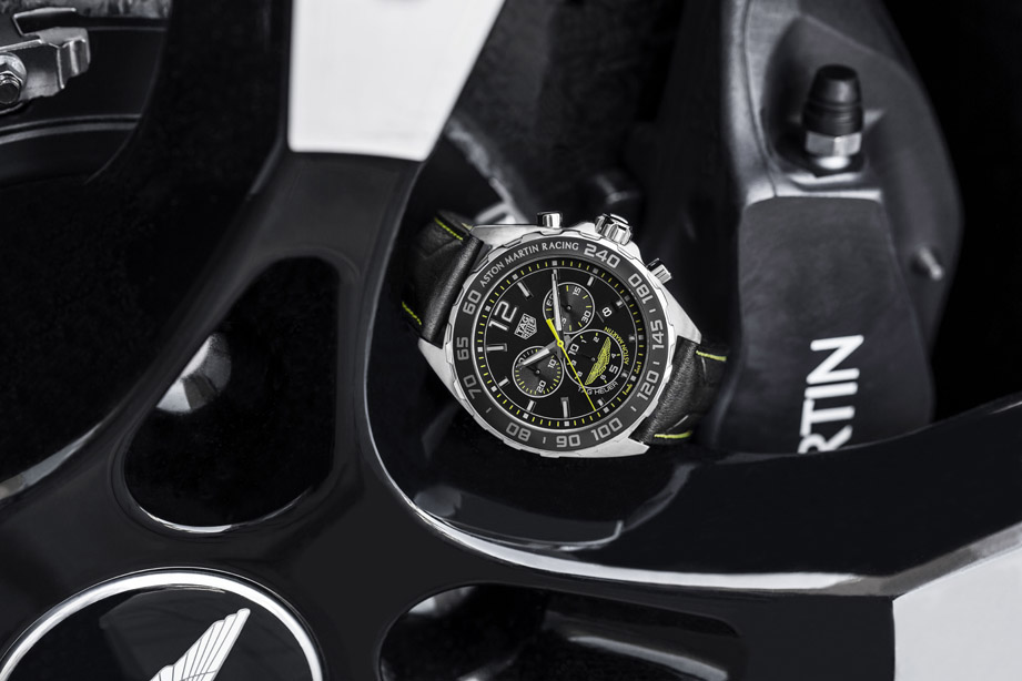 除了贊助車隊、在賽車上加上自己的Logo,作為腕錶品牌,ASTON MARTIN和TAG HEUER這一合作令人感到期待的莫過於雙方共同打造的聯名款式。在先前的報導中,我們已經看過品牌大使Patrick Dempsey(演員、賽車手)在利曼(Le Mans) 24小時耐力賽中佩戴一款Formula 1 ASTON MARTIN特別版計時碼錶參觀ASTON MARTIN車隊車庫,這款石英計時碼錶整體採不鏽鋼材質打造,直徑43毫米,並具有鋸齒狀邊緣的不鏽鋼錶圈、帶測速儀功能的鋁質上圈。ASTON MARTIN經典的翼式Logo與ASTON MARTIN字樣則印在6點方向的小錶盤上,同時它搭配了黑色Nappa小羊皮錶帶還是TAG HEUER首次在Formula 1系列錶款中使用真皮錶帶,展現出聯名款追求獨特的收藏特點。