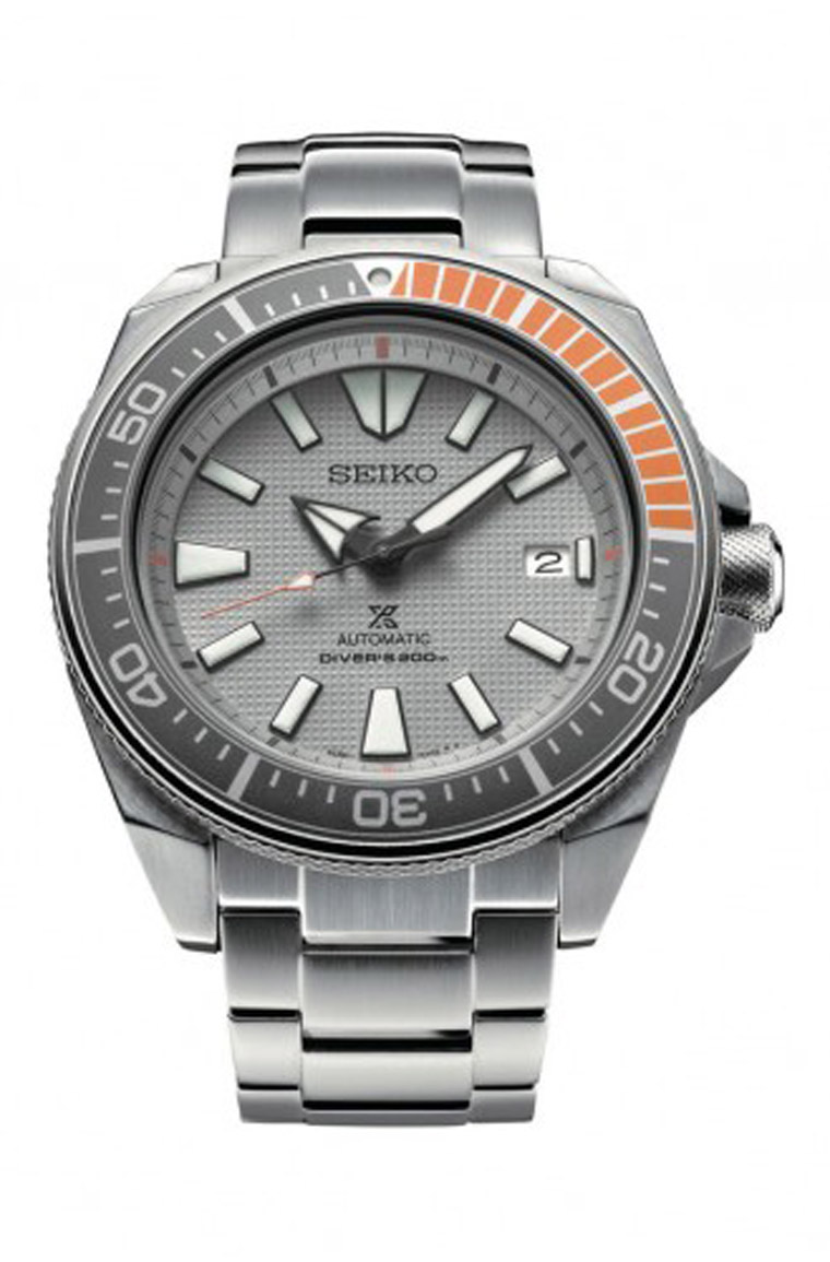 其中Prospex “Dawn Grey” Samurai SRPD03K1採用43.8毫米不鏽鋼錶殼,擁有單向定時錶圈、旋入式錶冠和200米防水等級。它搭載的4R35機芯於面盤三點方向開有日期窗,動力儲存41小時,擺輪震頻則為3Hz。SRPD03K1搭配不鏽鋼三板鍊帶,鍊帶可以在佩戴時略為延伸長度,戴起來更舒適。灰色面盤上飾有釘紋裝飾,而象徵黎明的橘色則是分佈在秒針、3、6、9、12等方位刻度以及錶圈前15分鐘的下潛時間刻度等部分,另外包括指針和時標都有夜光物料加強視讀效果。