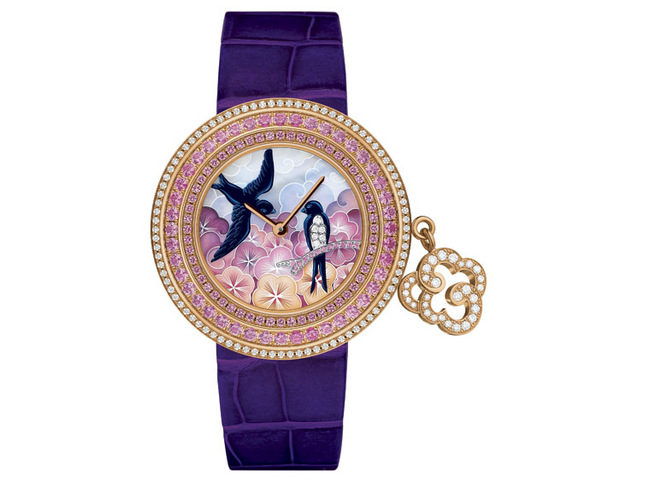 手錶描摹了一雙優雅矯健的燕子,象徵春回大地。在歐洲,相傳燕子會為所築巢棲息的屋舍帶來好運。梵克雅寶在這款手錶重溫兩大經典主題:一雙比翼齊飛的飛鳥象徵不渝愛情,以及1920年代起成為世家特色的燕子設計。雲狀幸運吊飾輕輕飄過面盤。