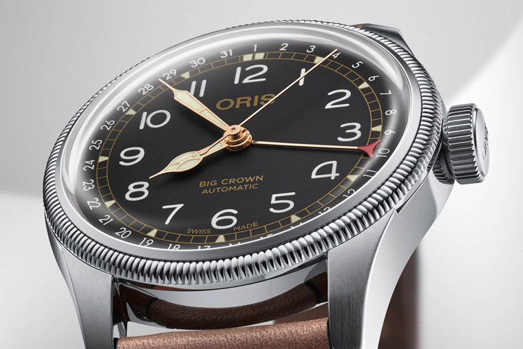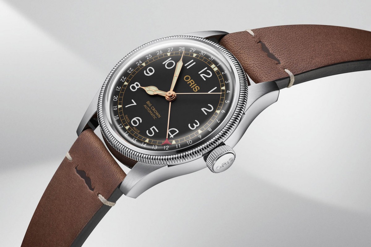 接著把話題轉回ORIS蓄鬍月特別版腕錶的身上,今年特別版很明顯是以Big Crown為藍本,黑色腕錶面盤佈局簡單清晰且一目了然,招牌軌道式日期顯示圈環繞於面盤外圍,透過尾端鮮紅色的三角造型日期指針精準告知當日日期,極具反差的用色立刻從時、分、秒針視覺中獨立出來。除此之外,教堂式時、分針及數字時標都填滿了Super-LumiNova®螢光塗層,在黑暗中看時間一樣清楚。另外在皮錶帶接近錶耳處可以看到鬍子圖案,這是蓄鬍月特別版的共同特徵。