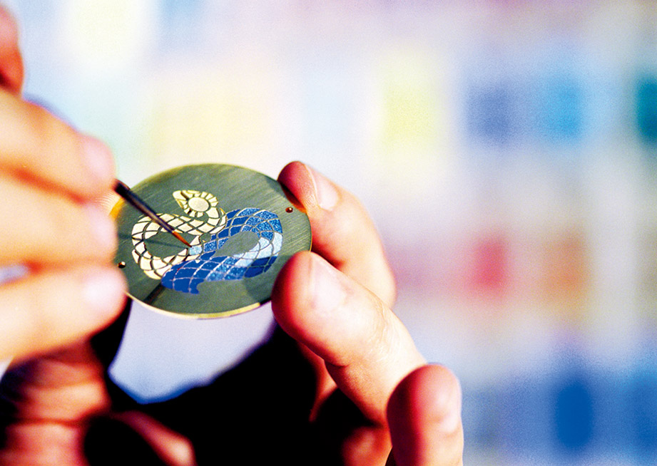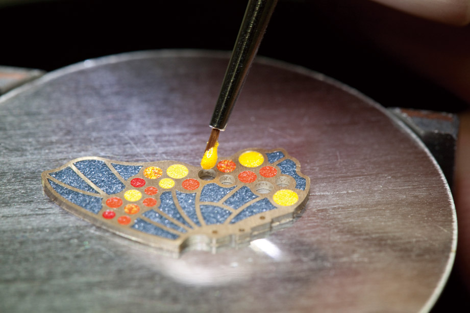 ▲內填法作品的特色之一為可延伸作畫空間至錶殼;其在各區隔空間中常會出現完全不同的色彩,此時需先考慮各色調釉料的熔點,從熔點高的顏料開始填色烘烤,後續再填覆下一種色調。