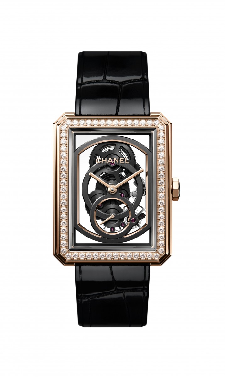 香奈兒於2015年推出的BOY∙FRIEND腕錶,首次搭載高級製錶鏤空機芯Caliber 3。歷經三年研發,品牌的第三枚自製機芯設計從任何角度賞析皆無懈可擊。一連串連接垂直輪系結構,懸浮於八角形BEIGE米色金錶殼中。鏡面拋光的BEIGE米色金凸顯機芯的層次,黑色錶橋則展現了機芯律動之美。