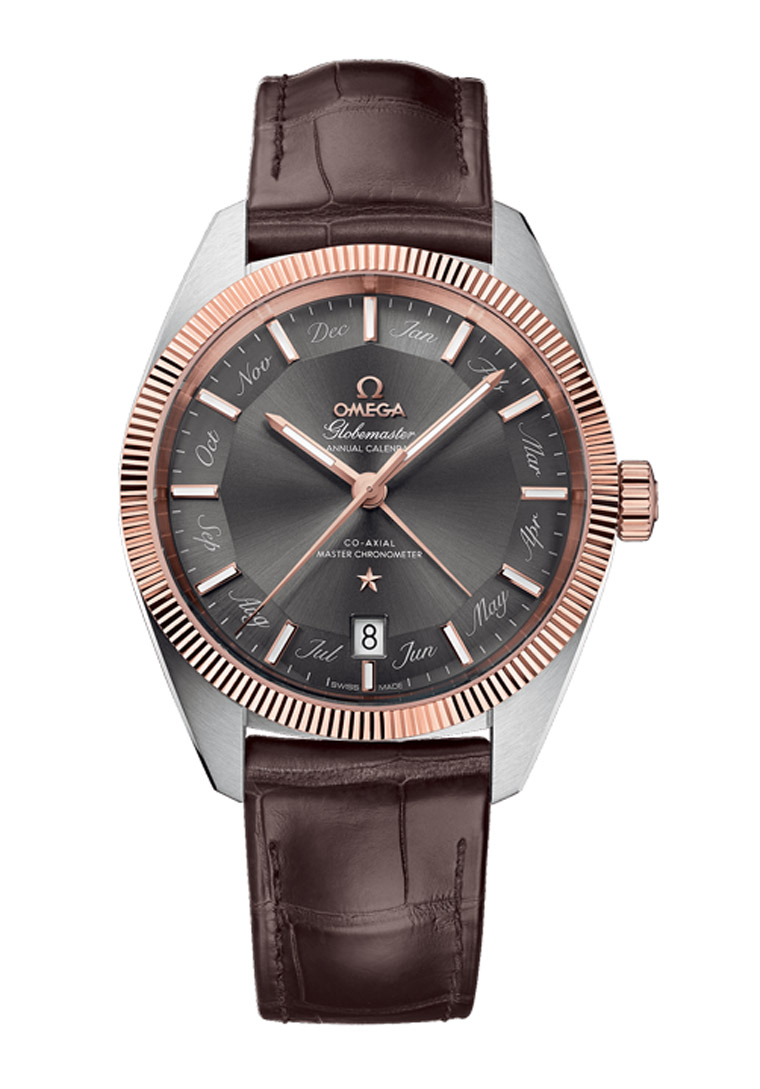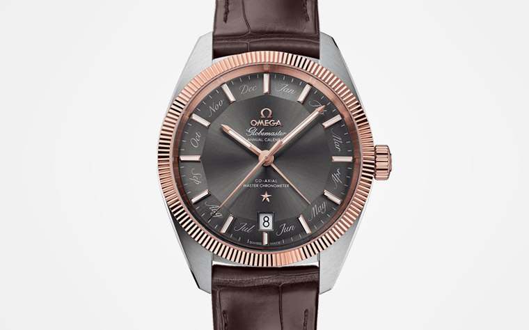 歐米茄Globemaster年曆錶徑從39mm擴大至41mm,除了晉身大錶行列,增大後的面盤也讓月曆顯示更為明顯,也算是以實用點為出發的改良。錶殼以不鏽鋼加Sedna金製成,12角型的面盤加上非常實用的年曆月份顯示,更叫人難以抗拒。隨著光線變化會露出不同炫光的灰色的面盤搭配白色月份字樣,均勻分布在金質時刻度之間,造型高雅。