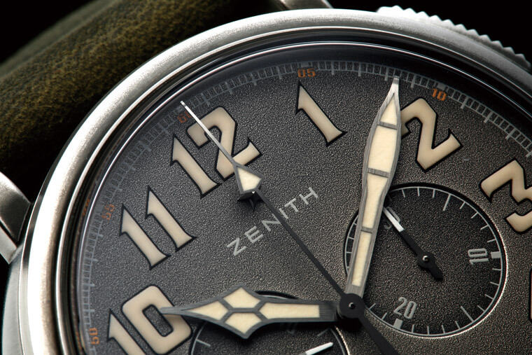 面盤要算是這款的外裝最突出的一個部分。ZENITH近期在面盤製法上有不少令人驚豔的表現,比如說'15年Elite 6150的陰刻式時標就相當復古迷人;Cafe Racer的盤面整片都有細目顆粒,而兩個子面盤則有中央亮、邊緣深的漸層,營造出經久褪色的復古質感。像這種效果是用海綿以手工反覆擦拭出來的,完全是硬功夫,目前ZENITH的面盤是由LVMH下屬的專業面盤老廠Artecad所提供的,除了同集團品牌之外他們也有為外部品牌代工。錶殼本身是經過舊化處理的不鏽鋼,不過為了多少幫45mm的大錶徑減輕一點重量,底蓋的部分用的是鈦金屬,另外錶扣的部分也是。錶帶的外層是同樣復古的綠色皮帶,但其實它的內層襯有橡膠材質,對於親膚的使用耐性更高。