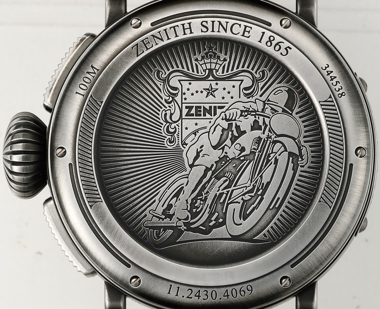 ZENITH這款以Cafe Racer為名的特殊款外觀上並沒有帶入太多機車的語彙,比較具體的大概只有底蓋上刻有騎士駕車的圖案,這裡訴求的主要是一種六○年代的復古風格。說來可能有點令人意外,Pilot Type 20自從2012年推出以來款式繁衍眾多,不過其中竟然並不包含純粹的計時碼錶,因此這款雖然是特殊款式,不過在功能上也有它獨一無二的賣點。錶款搭載El Primero機芯,錶面採雙眼顯示,由於錶徑高達45mm,因此子面盤往中央集中的印象還滿明顯的。