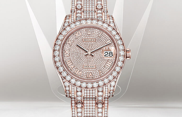 18ct永恆玫瑰金材質/3235自動上鍊機芯/時、分、秒、日期顯示/錶耳鑲鑽28顆、面盤鑲鑽713顆、錶圈鑲鑽36顆、鍊帶鑲鑽840顆/藍寶石水晶鏡面/防水100米/錶徑39mm/參考價:NT$ 6,743,000