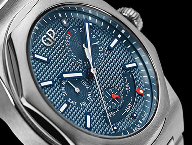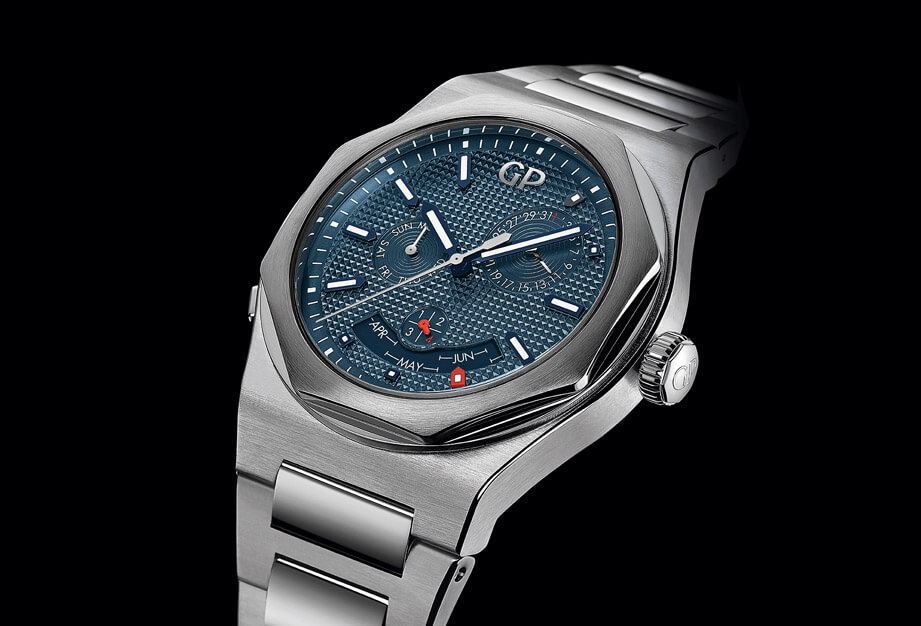 錶殼以直徑42毫米的不鏽鋼製成,經拋光及霧面交錯處理。貼服手腕的錶帶採用相同材質及修飾處理,品質毫無二致。Laureato Perpetual Calendar桂冠系列萬年曆因此呈現獨特的全鋼面貌和不對稱感,也將腕錶強烈的建築美學表露無遺。裝飾巴黎釘紋圖案的藍色面盤與白色顯示形成搶眼對比,為這款充滿現代感的腕錶增添畫龍點睛之妙。
