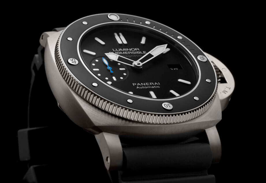 錶款黑色面盤於3點鐘方位設日期顯示;鑲嵌沛納海藍色指針的小秒盤則設於9點鐘方位,附有白色夜光塗層小時刻度,確保夜間及水底能見度超卓。刻度、指標及分度標均採用Super-LumiNova® 夜光塗層,即使身處漆黑環境也清晰易讀。在晚間或水底時,分針及錶圈上12點鐘方位的鑲飾刻度發出耀目藍光,取代傳統刻度的發光綠色,時刻清晰辨讀,計算下潛時間精準無誤。