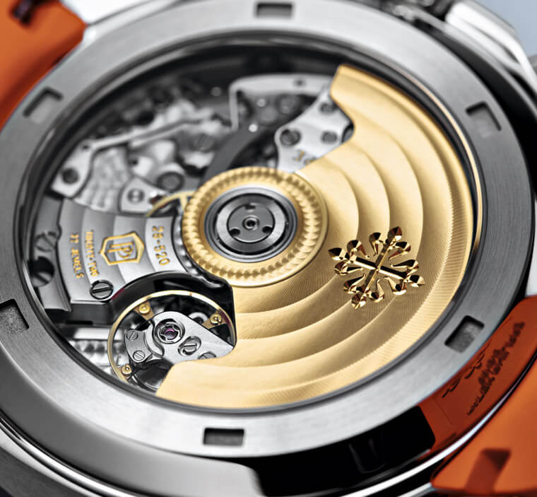Ref.5968A搭載的是CH 28-520 C自動機芯,先前已經套用在例如Nautilus系列的作品上,所以對於喜歡百達翡麗的人而言並不陌生,該枚機芯既有傳統的導柱輪裝置,同時也結合比較晚近發明的垂直離合機制,理論上較能避免計時功能啟動時指針顫動的現象,也因為垂直離合能將零件之間的摩擦情況降至最低,所以即使把中軸計時秒針當作大秒針使用也不會加速機芯零件的磨損情況,可以安心使用(這也是為什麼錶款不像一般計時碼錶會設置小秒盤的原因)。再者CH 28-520 C的計時具有飛返功能,面對需連續計時的狀況,它的實用性相對也高,整體而言Aquanaut計時功能初體驗各方面條件都有到位,讓偏好PP運動錶的人有了再次出手的理由。