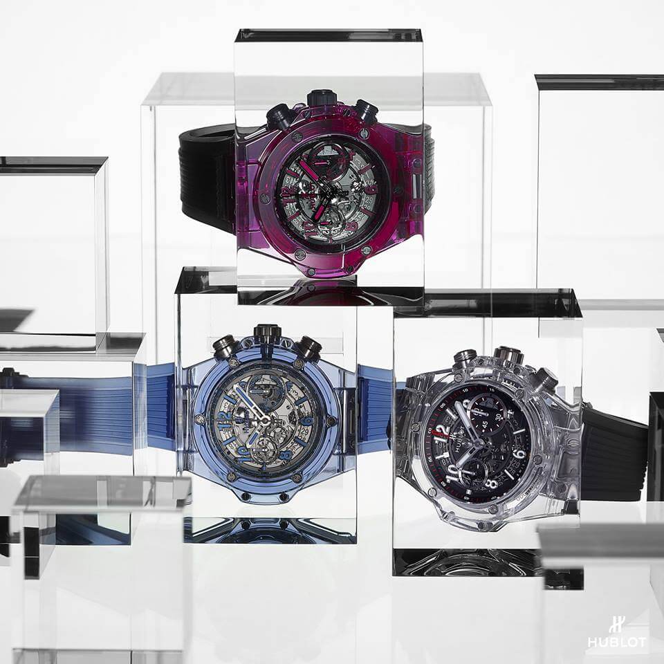首發藍寶石透明錶殼作品推出後,宇舶又在2017年嘗試將氧化鋁(Al2O3)和金屬鉻(Cr)混合並經2000℃左右的高溫燒製,最終成功獲得藍色藍寶石水晶的成果,同年品牌又實驗出將鐵和氧化鋁結合再經高溫加工,這次得到的則是紅色藍寶石水晶,因此在這一年中的Big Bang Unico計時碼錶從純粹透明昇華至有了藍色調和紅色調點綴的彩色透明手錶。