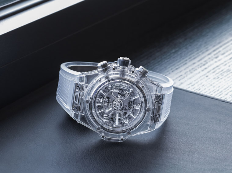 2016年宇舶推出的首款透明手錶是Big Bang Unico計時碼錶,這是一款從頭透明到腳的手錶,包括錶徑、錶圈、錶體到底蓋都是藍寶石水晶材質,配上霧面半透明的橡膠錶帶,頓時讓人看起來覺得好清涼又好新鮮。呼應一下前面提到的,藍寶石水晶材質為什麼難切割,因為他的摩氏硬度達到了9,附帶一提,鑽石的摩氏硬度是10,也就是說藍寶石真的是很難切割,它比我們常見用於製錶的金屬都硬多了,而且別忘了Big Bang系列的結構本來就很複雜,金屬要拿來製作Big Bang的錶殼已有一定難度,可見要把藍寶石材質化為這系列的錶殼有多不容易,然而箇中的訣竅屬於商業機密,只能說宇舶找到了突破這個技術關卡的鑰匙,所以他們能夠比較大量地生產透明錶殼。