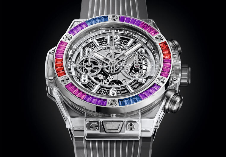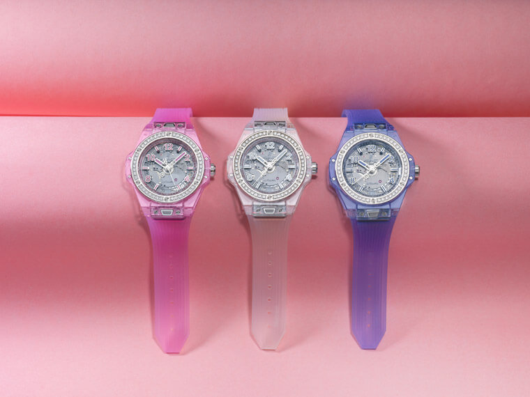 2018年宇舶再次幫透明手錶加碼,這次雖然沒有出現新顏色的透明殼,但是品牌結合了錶圈鑲彩色寶石的新設計,讓Big Bang Unico藍寶石水晶計時碼錶看起來更能呼應「銀河」這樣的主題,錶圈上集合紫色、紅色、橘色、藍色等共48顆彩色寶石,詮釋出科幻電影看過的色調萬千的銀河印象。而同樣是在2018年,宇舶又一次領先其他人,把藍寶石材質倒入女錶創作中,推出Big Bang One Click女錶,這系列共有透明、粉紅和粉藍三種藍寶石錶殼,同時錶圈又再額外鑲嵌超過40顆鑽石,讓女錶不只是華麗高貴,也因為透明的獨特個性,看起來別具一股時尚潮感。