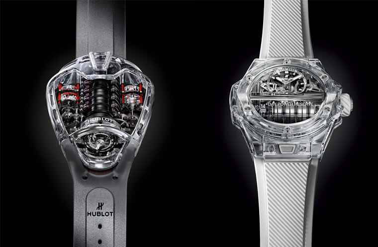 ▲除了Big Bang計時碼錶,宇舶的透明錶殼設計也延伸到MP系列這種複雜且造型獨特的旗艦款中,圖為MP-05(左)和MP-11(右)等透明錶殼式。