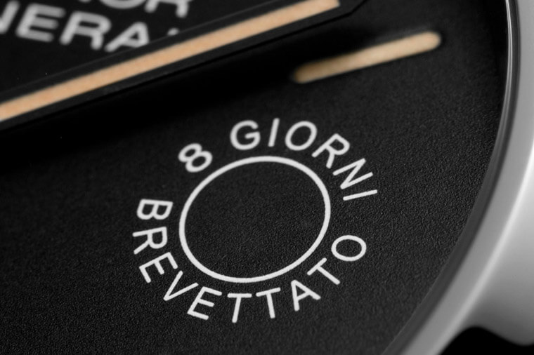▲面盤3點方向與小秒盤左右呼應的字樣為"8 GIORNI BREVETTATO”這句義大利文,主要用意是要突顯錶款的長動能。