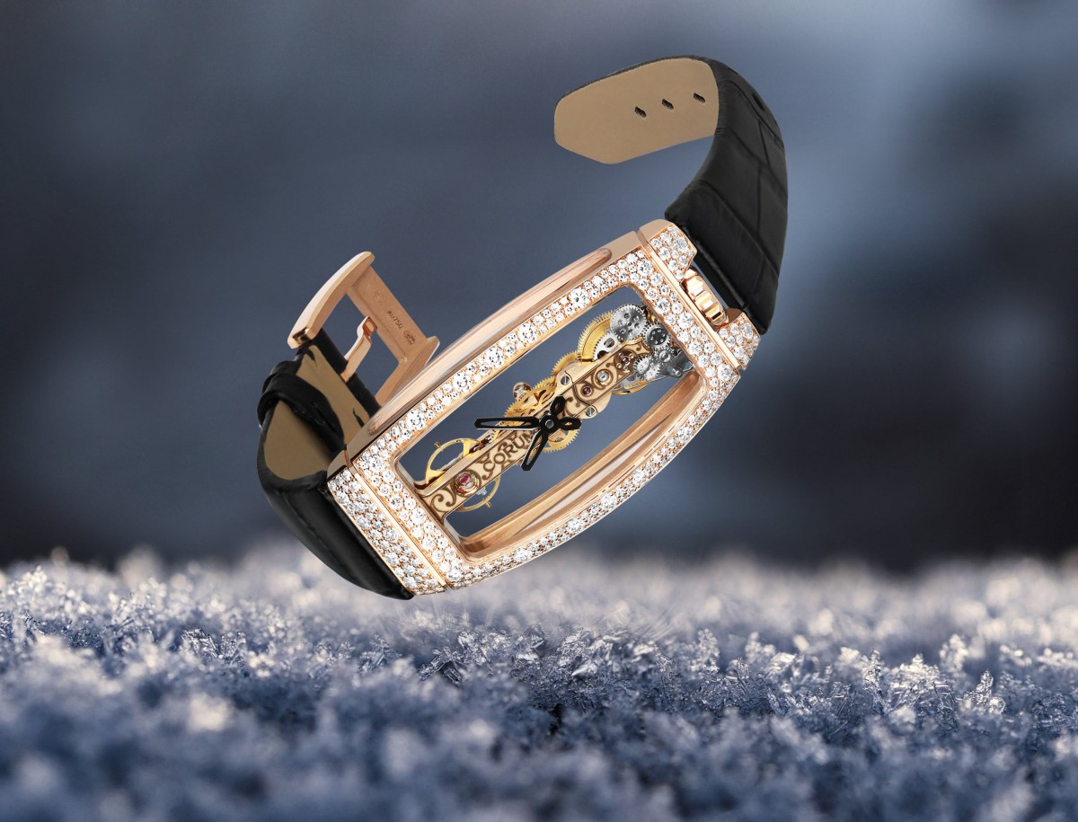 18K白金材質/CO 113手動上鍊機芯/時、分顯示/錶殼鑲鑽/藍寶石水晶鏡面、透明底蓋/防水30米/錶徑51x34mm/參考價:NT$ 2,298,000,另有18K玫瑰金款式