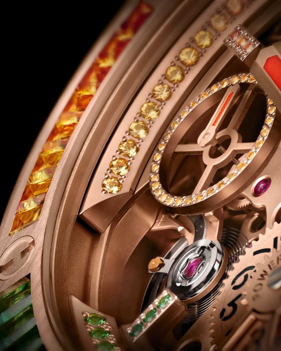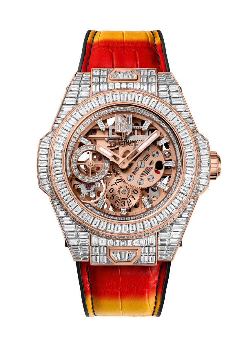 18K皇金材質/HUB1201手動上鍊機芯/時、分顯示/雙動力儲存顯示/錶殼鑲嵌彩色寶石/藍寶石水晶鏡面/防水100米/錶徑45mm/限量30只/參考價:NT$ 2,253,000