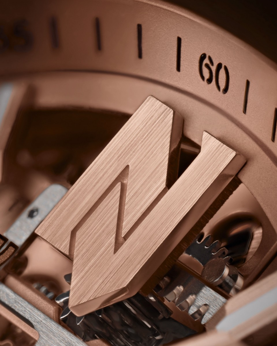 在黑陶瓷腕錶在面盤12點位置展示Nicky Jam的姓名縮寫”NJ ”標誌。他的手寫簽名則印在錶背的透明藍寶石水晶鏡面上。