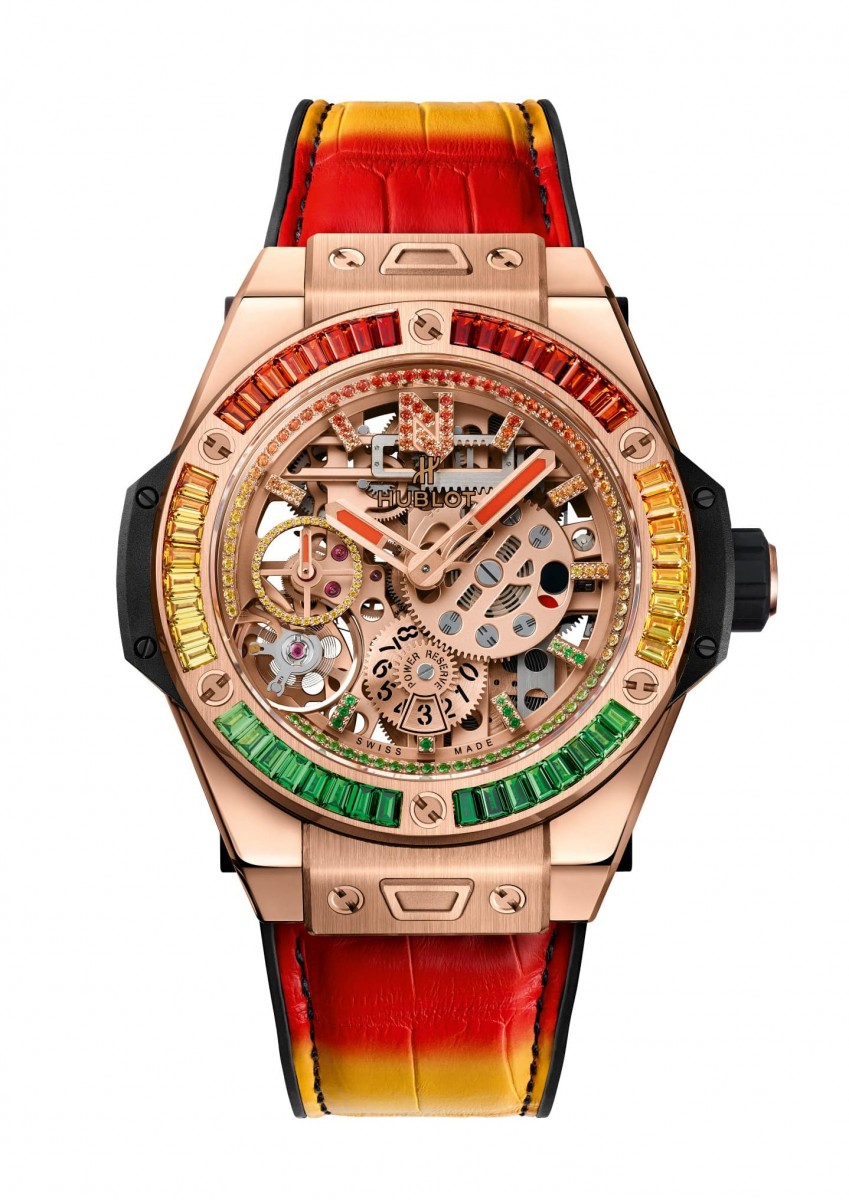 皇金彩寶腕錶採用Nicky Jam最鍾愛的金色做為裝飾。錶殼、錶圈與錶冠以宇舶專利King Gold皇金打造,在18K金中加入了黃金、銅與鉑金,顏色飽滿、歷久不衰。其上並鑲嵌各種華麗彩色寶石,包括黃色藍寶石、橙色藍寶石與沙弗來石,呼應他個人單曲《X(Equis)》影片中出現的三種顏色。