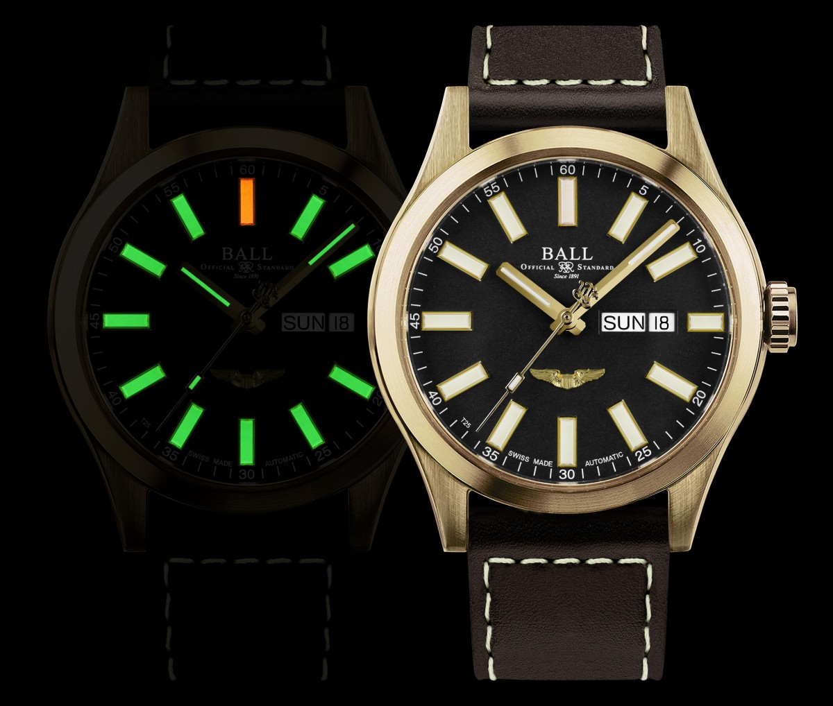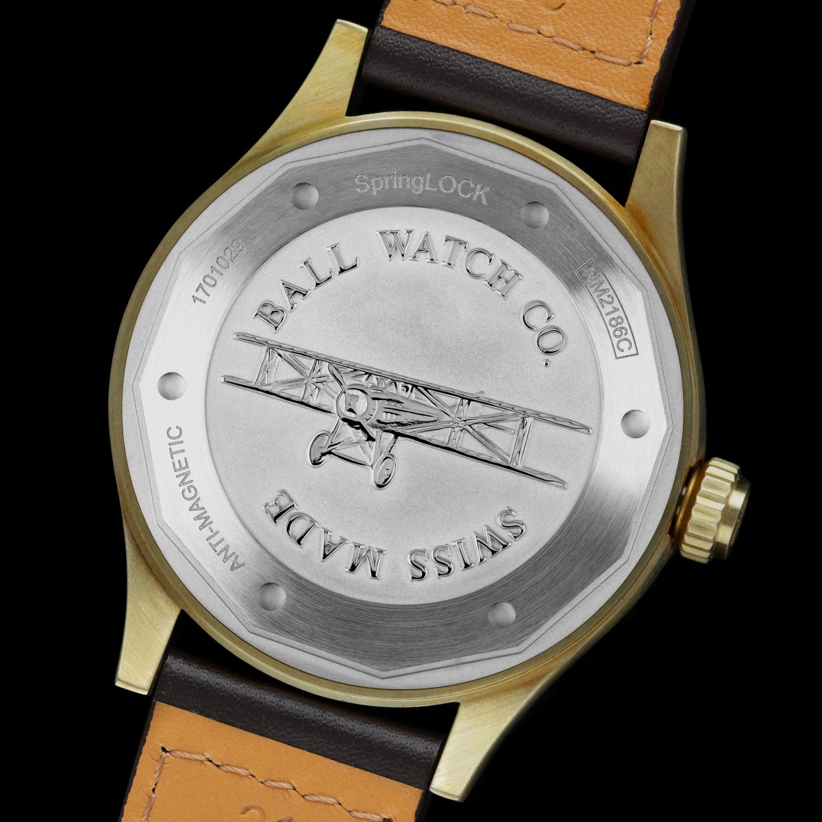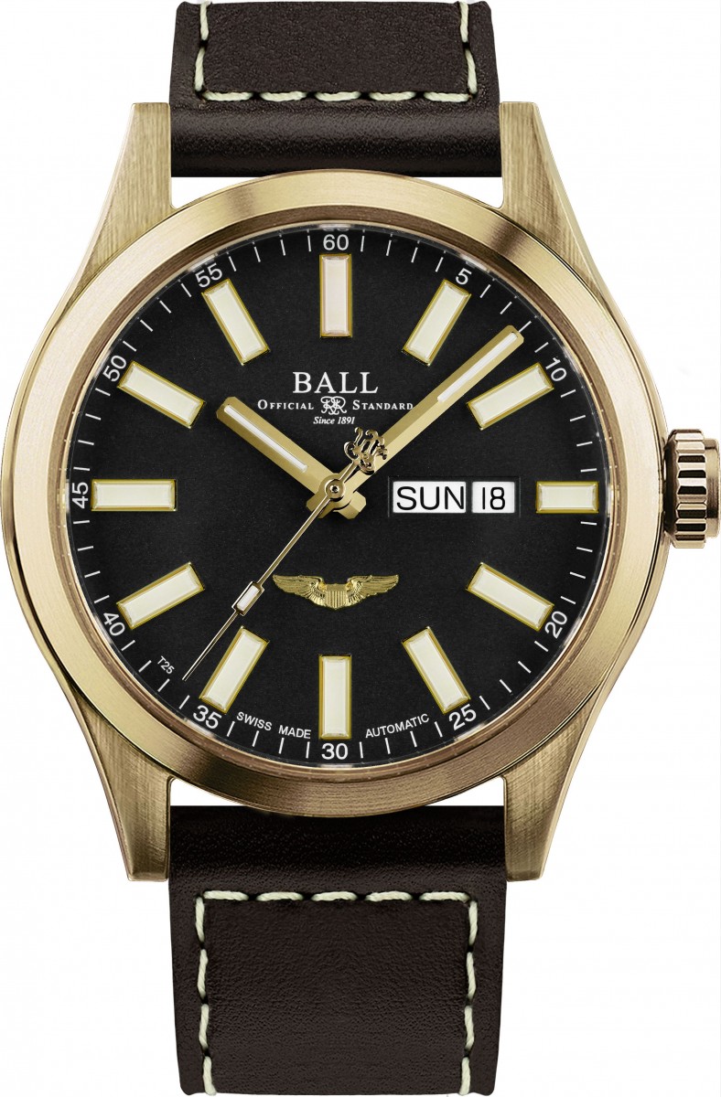 以復古飛行錶為設計靈感,面盤佈局自然以簡潔為主,霧黑色的面盤對比鮮明。數字再以金色線條包圍,不但使其顯得更為立體,也與青銅顏色互相襯托。在6時位置的上方刻有美國空軍機師專屬徽號 (U. S. Air Force Pilot Wings) ,呼應手錶飛行主題。指針及小時刻度均鑲有BALL WATCH享負盛名的自體發光微型氣燈,提供無可比擬的取讀性,另腕錶在黑夜也展現獨特風味。