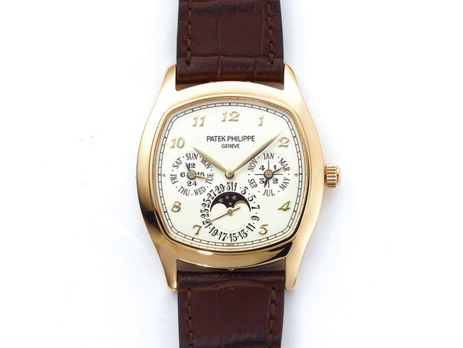 這款Ref. 5940是百達翡麗繼2010年的追針計時碼錶5950之後再次使用椅墊形錶殼,說來椅墊形錶殼並不算特別少見或是復古的樣式,不過百達翡麗畢竟還是以圓錶為主,非圓錶的「異形」錶殼只能整合成一個Gondolo系列,是以像Ref. 5950、5940這樣的款式還是彌足珍貴。椅墊形錶殼除了從設計上看它直線、曲線的比例,錶殼本身的作工也很值得注意,尤其像Ref. 5940這種錶圈、上錶殼和錶耳一體成型的結構,主要部件交界處的線條、平面的修整都可以展現出錶廠加工的品質。面盤的部分百達翡麗這次導入了一種新技術,盤面上使用的塗料中混入了一些金粉,極近距離細看的話隱約看得到一點金光,不過這道工序更顯著的效果是讓面盤呈現出一種像是紙張一樣的質感,看起來非常舒服。機芯搭載的是240 Q微型自動盤機芯,算是百達翡麗萬年曆款式的幾枚標準機芯之一,不過就像前面提到的,雖然是舊型號,卻通過了百達翡麗印記的認證,除了裝飾之外,精度也有高水準的保證。