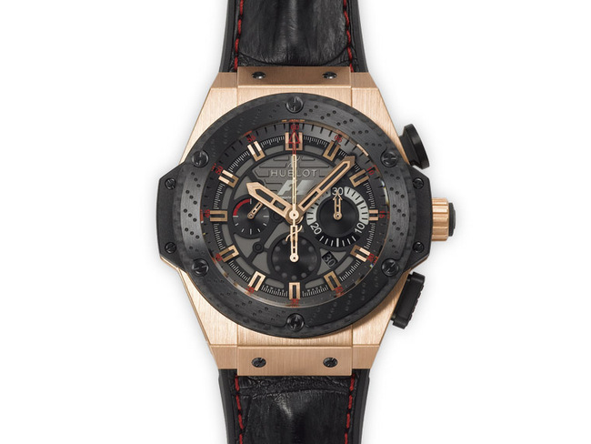 18K玫瑰金材質/HUB 4100自動上鍊機芯/時、分、小秒、日期顯示/計時碼錶功能/鱷魚皮、橡膠錶帶、摺疊扣/藍寶石水晶鏡面、螺絲固定式透明底蓋/防水100米/參考價:NT$ 1,391,000