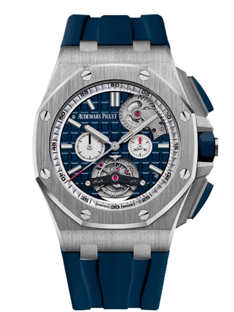 AUDEMARS PIGUET愛彼皇家橡樹離岸型自動上鍊陀飛輪計時碼錶延續近年來系列的彩色變身,搭載品牌自製的2897自動上鍊機芯,更結合親切的不鏽鋼材質,為款式帶來一番新氣象。