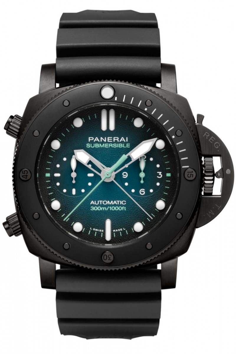 腕錶採用47毫米鈦金屬錶殼,配搭類鑽碳鍍膜外層,令防撞和防刮表現更優秀。腕錶以黑色塑造陽剛的運動造型, 洋溢堅毅強悍的當代格調。部分小時刻度和指針,呈現別出心裁的翠藍色澤,教人瞬間聯想起法屬波利尼西亞海域。 這只精準的計時碼錶,配備飛返計時和秒針歸零功能,確保腕錶與參考的報時信號完美同步。