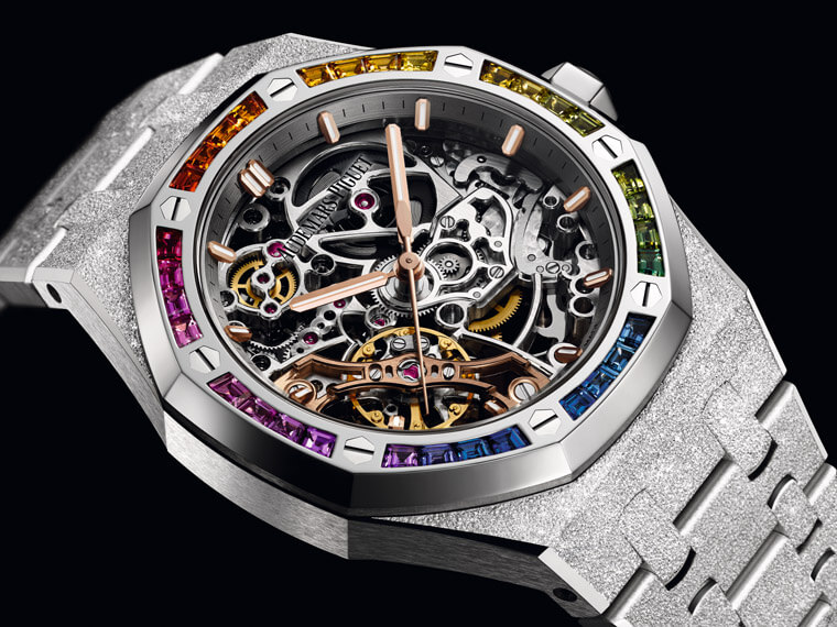 ▲AP霜金錶殼和錶帶搭配「彩虹色調」藍寶石嵌飾錶圈,展現陽光的神奇魅力。