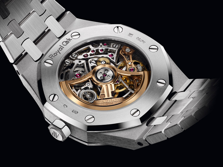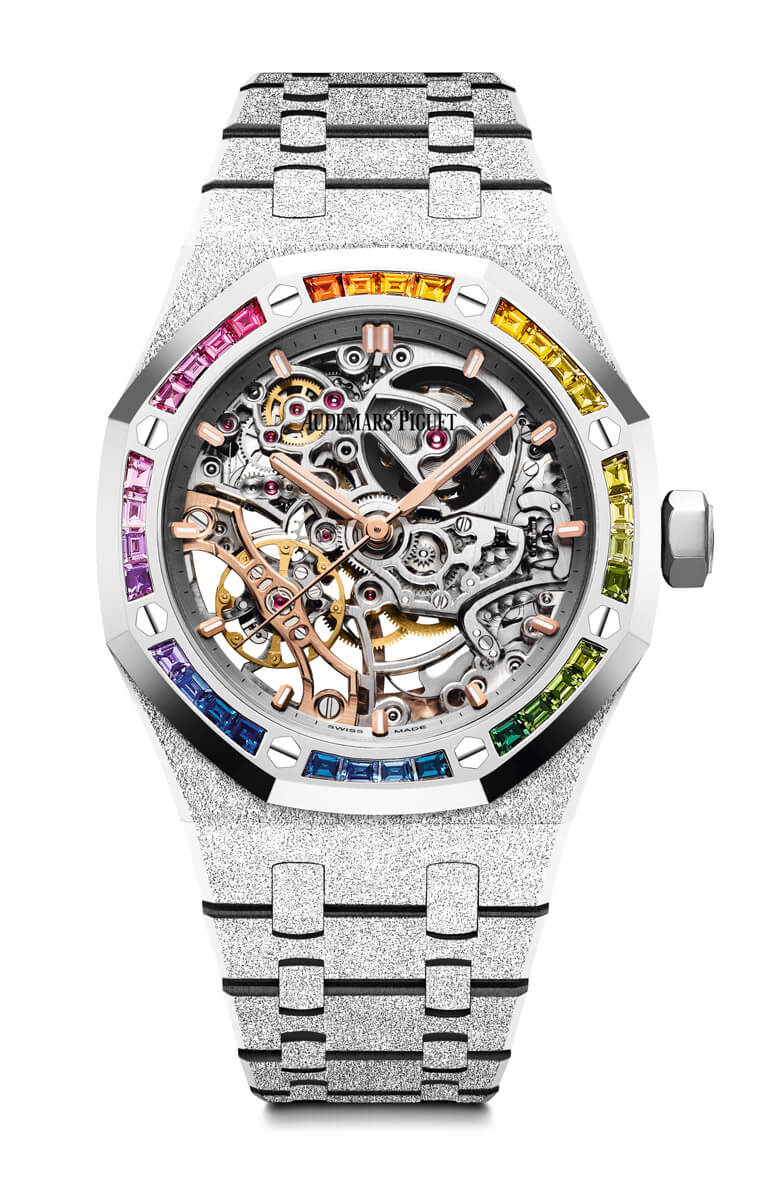 皇家橡樹系列霜金鏤空雙擺輪腕錶錶徑37mm,以經錘擊潤飾的18K白金錶殼而成。錶圈鑲飾著「彩虹色調」長方形切割藍寶石,32顆寶石各自經過了精心細緻的切割,共有2.24克拉,輝映著微光粼粼,雪絮虹彩般的夢幻錶款,展現陽光的神奇魅力。此錶愛彼自製的搭載3132自動上鍊機芯,透過經防炫光處理藍寶石水晶玻璃鏡面與底蓋,可以觀賞金質雙擺輪機制。這項享有專利的創新機制採用了十分複雜的製造工序,卻能因而提升腕錶的走時精確度和穩定性。在同一個軸線上組裝雙擺輪和雙游絲,整個系統完美地同步擺動。