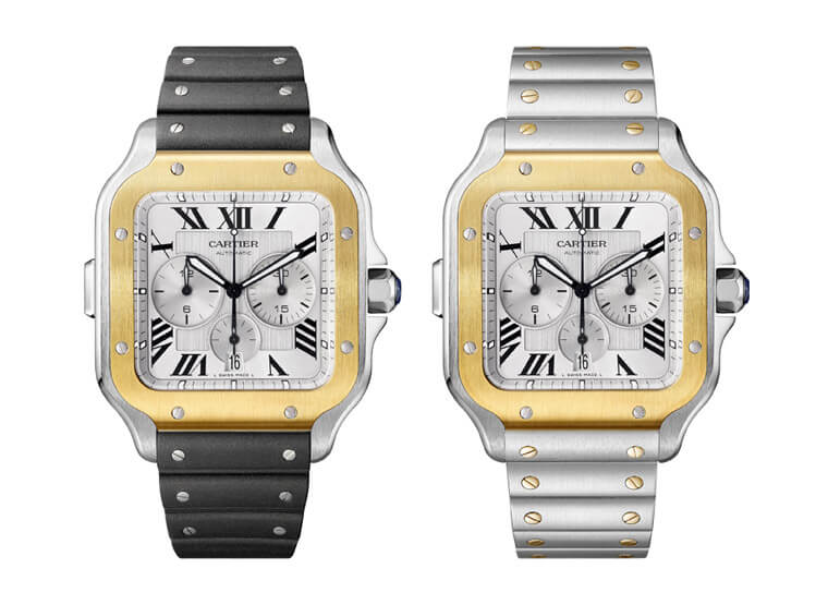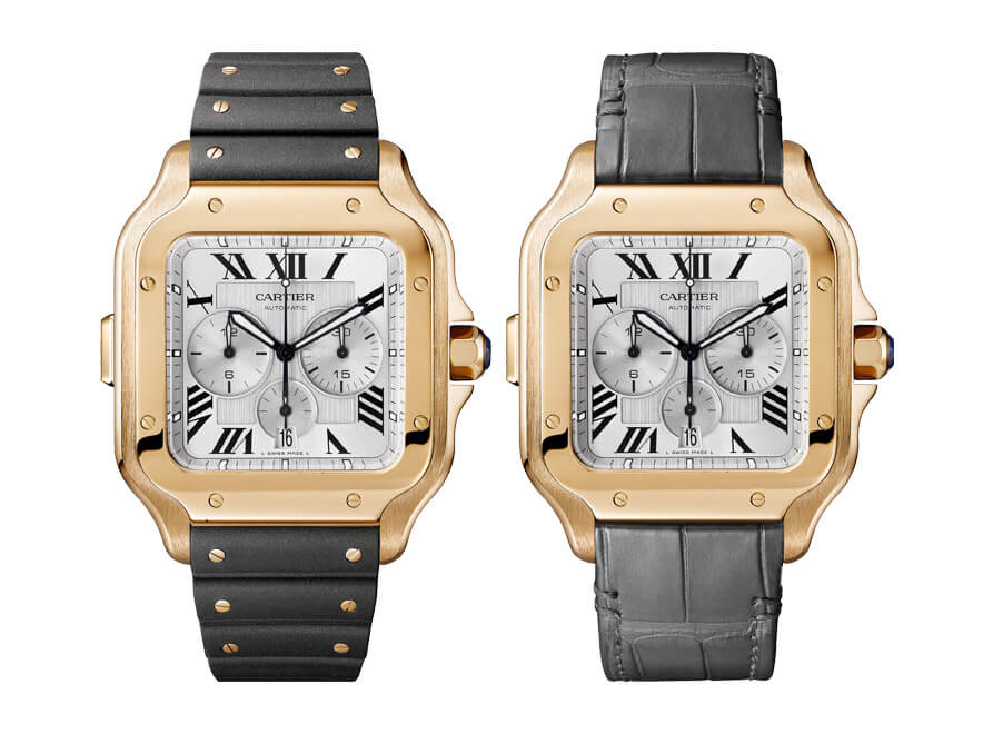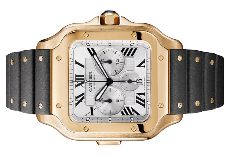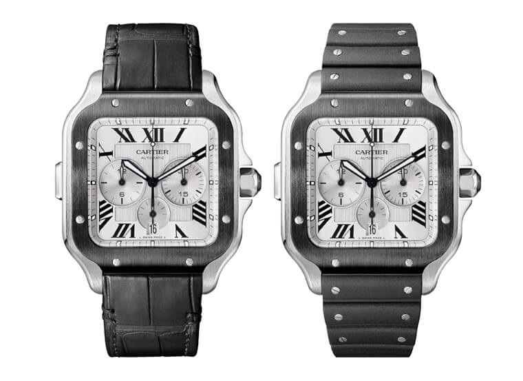 飛行錶本身與計時功能原本就是相當速配的組合,因為飛行員必須要隨時保持對時間的敏銳度,從而可以獲取時間、速度與距離等相關資訊,因此在2019年新款的Santos de Cartier系列上,卡地亞再次將計時功能導入其中,Santos計時碼錶統一採用超大型錶殼設計(詳細的錶徑資訊還需等品牌進一步公布),比起同時間另外發表的二針錶和鏤空錶(皆為大型款,二針錶另有小型款)都稍微大一些。錶款共有不鏽鋼、半金與玫瑰金材質等三種主要款式,其中不鏽鋼款的錶圈覆上ADLC鍍層看起來更具有視覺層次,此外卡地亞今年還新增了外觀上近似鍊帶的橡膠錶帶,其上也煞有其事地鎖上了螺絲,使得橡膠錶帶遠看隱隱有幾分金屬鍊帶的仿真感,不過戴起來的感覺又有滿明顯的差異。