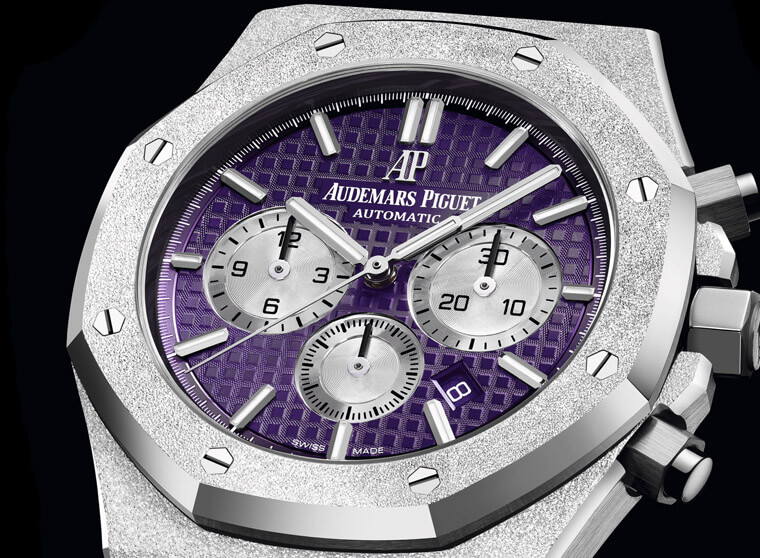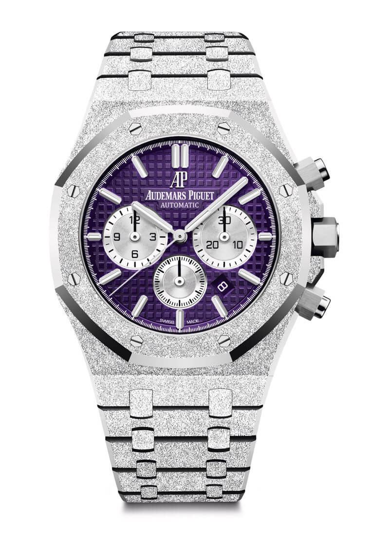 皇家橡樹系列霜金自動上鍊計時碼錶,採用經過霜金處理的18K白金打造錶徑41mm的錶殼,連同錶帶皆用錘擊潤飾,增加視覺變化。皇家橡樹系列著名的八角形錶圈,以拋光工藝打磨斜邊,為霜金增添冷冽光澤,更加烘托深紫色的"Grande Tapisserie"大型格紋裝飾錶面。銠色計時器、金質立體時標和螢光指針,也使錶面色彩更加亮麗。此錶款搭載的2385機芯,是愛彼旗下相當著名的薄型自動機芯,由於這枚機芯的製作過程目前都在品牌內部完成,說它是自製機芯其實並不為過,在錶款亮眼的外型之下,提供準確走時的強力後盾。