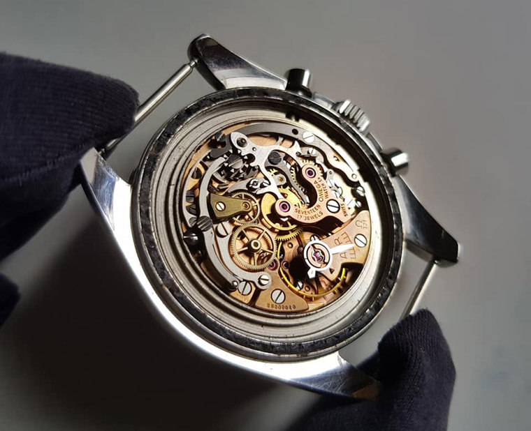 ▲結構與321幾乎相同,是兩眼的計時碼錶機芯,同樣有檔桿,屬於早期的設計。