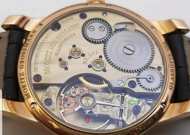 ▲左邊雙紅圈為擒縱叉限位釘,下方的紅色箭頭指向游絲固定樁(特別以一根彈簧鎖定)。右邊的綠色箭頭指向一字形的微調螺絲(唯一僅見刻度是雕飾出來的,不是用印刷處理)。