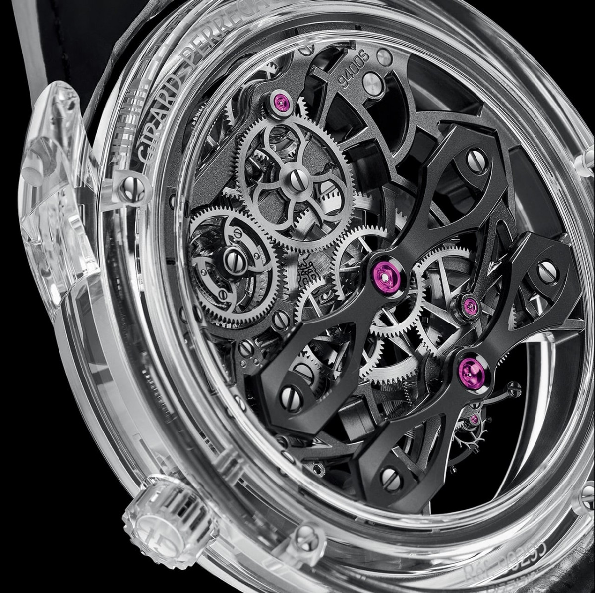 P9400-1035型機芯是9400型機芯的改裝版,前者去除了主夾板。由此創造出一個猶如真空空間,機芯就如處於近乎無重的狀態。只留下實際上必要的固定點,猶如上演空中雜技。錶橋在視覺上有助於構建Quasar腕錶整體的透明效果,以鈦金屬製成,先後經過噴砂和PVD鍍黑色工藝處理。錶橋的造型在全部三個維度都極為複雜,內角、拱形、迴旋、懸垂應有盡有,足見加工難度之大,是名副其實的製錶工藝壯舉。