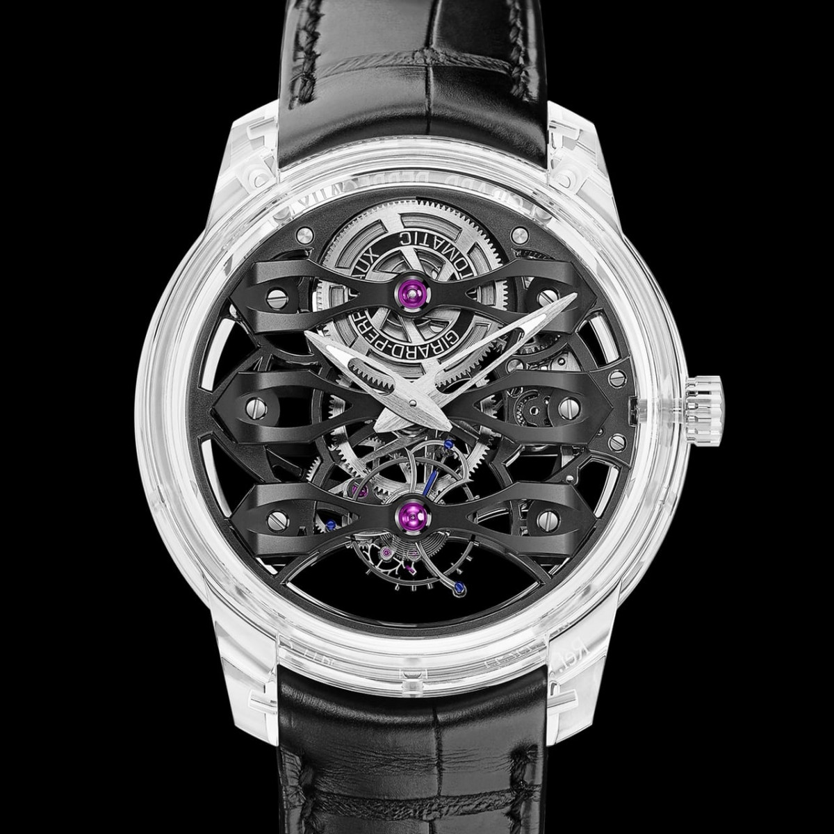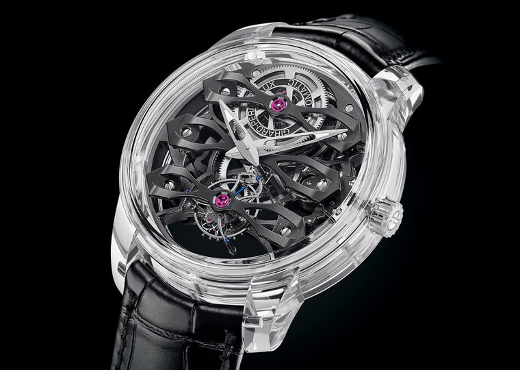 直徑45毫米的Quasar錶殼完全由藍寶石水晶玻璃製成。形似玻璃罩的表鏡罩住拱形機芯板橋,好似蒼穹覆蓋大地。整個表殼側緣採用一體式設計,包括各個曲面和稜角分明的表耳。在將近3,000度的高溫下,氧氣與氫氣燃燒形成熾熱氣流,從而使基本粒子融合成一體,而藍寶石水晶便是通過這種工藝打造而成。接下來的步驟是切割、加工、鑽孔、形成拱形並拋光,所用工具均使用宇宙最堅硬的物質──鑽石製作。