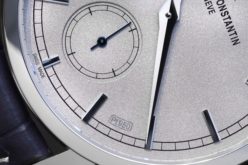 噴砂面盤上飾有纖細的鑲貼時標和軌道式分鐘刻度圈,而位於6點鐘位置的小秒針則從視覺上展現了絕妙平衡。4點和5點刻度之間的"Pt950"標記則低調表明時計屬於限量鉑金珍藏系 列。腕錶搭載品牌研製的4400 AS手動上鍊機芯,精準可靠,可提供約65小時的動力 儲存,彰顯高級製錶傳統的精髓。透明藍寶石水晶錶底蓋,盡顯機芯上經由手工打磨修飾的精緻細節。