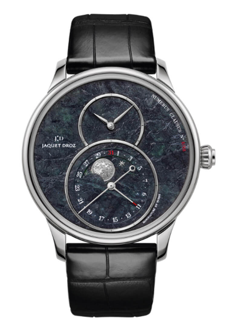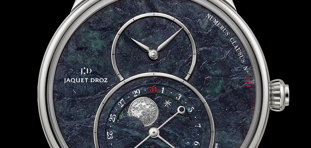 錶款添加月相功能,並結合石材以設計出擁有不同層次的錶盤,令腕錶呈現全新的縱深立體感。品牌專門研發出更精密的月相齒輪,能夠比傳統59齒驅動齒輪產生的常規誤差更準確捕捉月相動態,令機芯能夠精準無誤地連續運行122年,而天文月相可通過設於錶殼8時位置的校正按把進行調校。