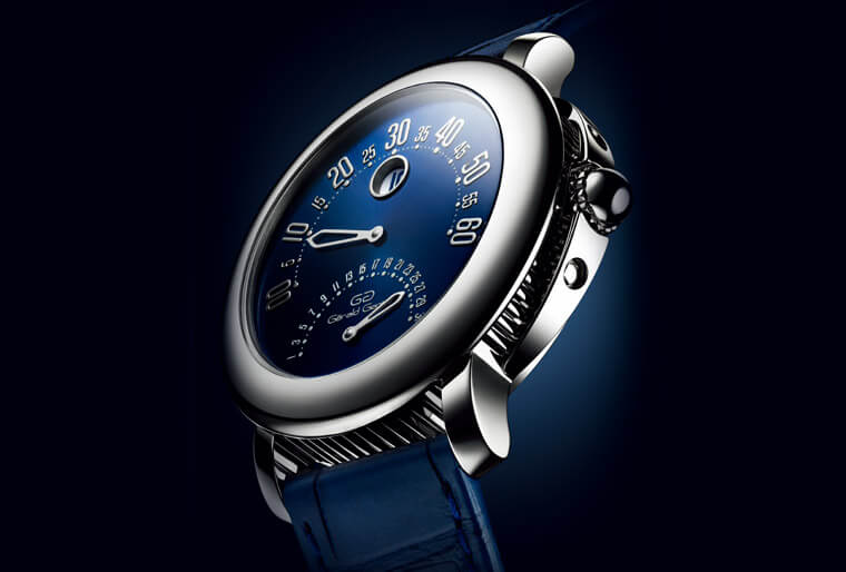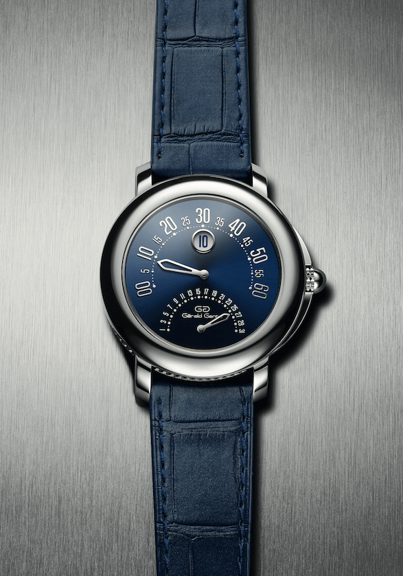 至於這款GERALD GENTA 50週年腕錶採用著名的圓形Arena錶殼,光滑寬闊的弧形錶圈以高度拋光的鉑金製作。跳時功能透過設於12點鐘位置的視窗顯示,而分鐘則刻於跨越藍色漆面錶盤上半部分的拱形上,分針每隔60分鐘就跳回歸零。日期刻度則設於6點鐘位置較小的拱形上。