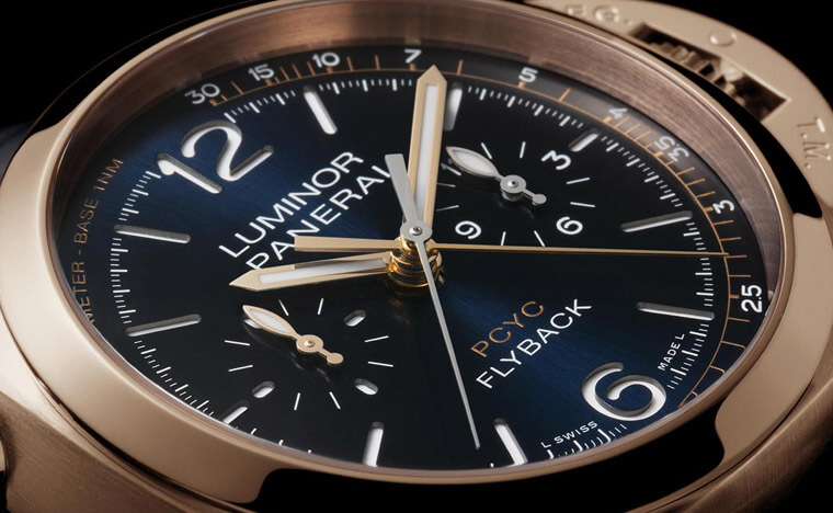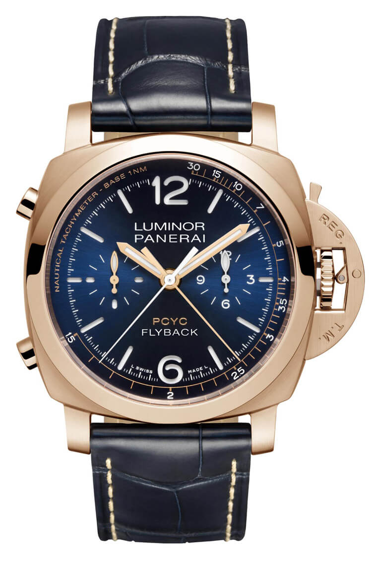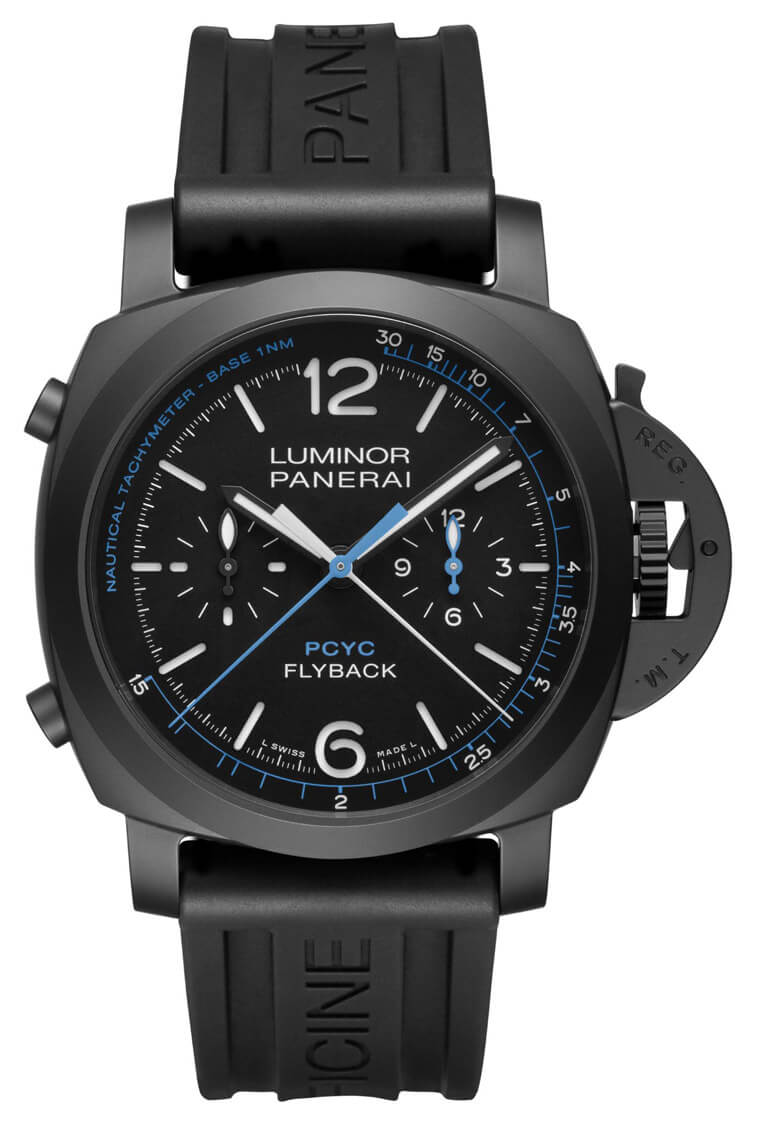 錶款的面盤設計一如其他搭載P.9100自動機芯的沛納海手錶,除了九點方向的小秒針,三點方向為12小時計時盤,至於中軸兩枚細長的指針並非追針,而是同軸的飛返計時秒針與分針。這款的面盤時標刻度再次採用了品牌著名的三明治式設計,將夜光物料夾在上下兩層圓盤中,而不另行於時標表面塗上夜光物料。面盤六點方向印有”PCYC”與”FLYBACK”字樣,飛返功能是錶款的主要特色,至於”PCYC”則代表了”PANERAI CLASSIC YACHTS CHALLENGE”之意,清楚說明錶款的古典帆船挑戰賽設計主題。