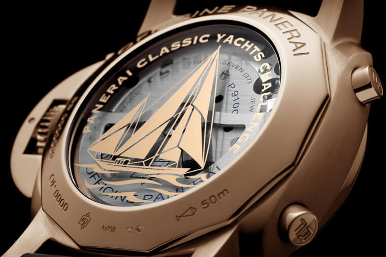 ▲玫瑰金款採用透明底蓋並印上帆船圖案,底蓋露出P.9100機芯的自動盤與底板等機芯組件。