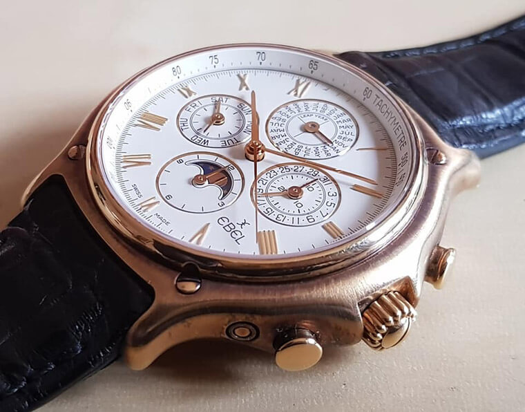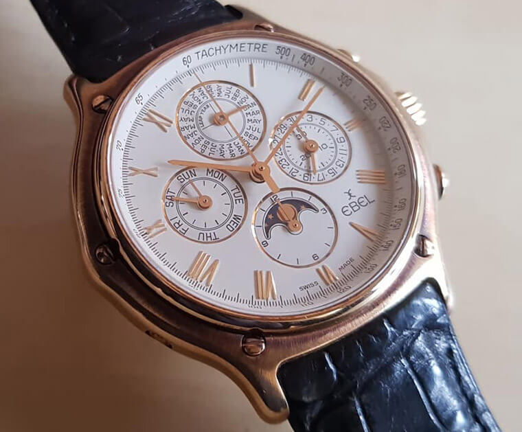 這只1990年代的EBEL計時萬年曆錶是非常少見搭載以ZENITH El Primero為基礎的錶款(當年大都以Lemania為基底,EBEL的機芯編號為139)。其它的萬年曆模組與VC在1990年代的計時萬年曆錶所採用的上層模組相同(當時VC的基礎為FP1185)。