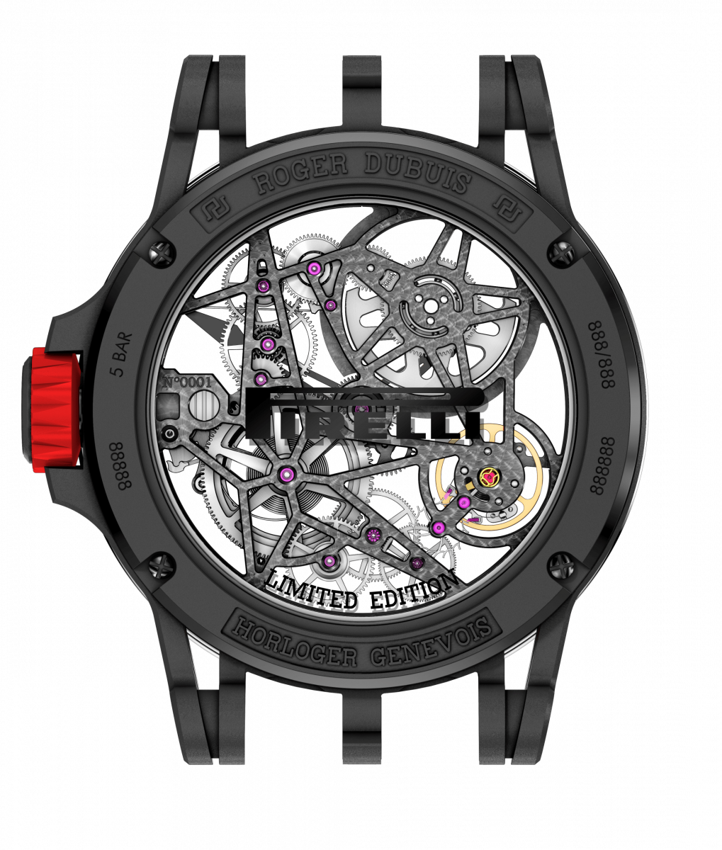 限量發行88只的紅色新款Excalibur Pirelli自動鏤空腕錶也在這次車展上首度亮相,加入羅杰杜彼超跑風格的時計陣容。此錶款所配備的錶帶鑲接著經倍耐力認證的輪胎橡膠皮,同時錶帶背面裝飾著倍耐力CinturatoTM中性胎傳奇性的獨特胎面紋路。其堅實耐用的黑色 DLC鈦合金錶殼則傲然搭載著RD820SQ機芯,透過「Astral Skeleton星辰鏤空」經典造型元素的抬高位置,以及羅杰杜彼獨特微型自動盤的結構與高度,強調高級製錶複雜機芯的迷人立體結構。