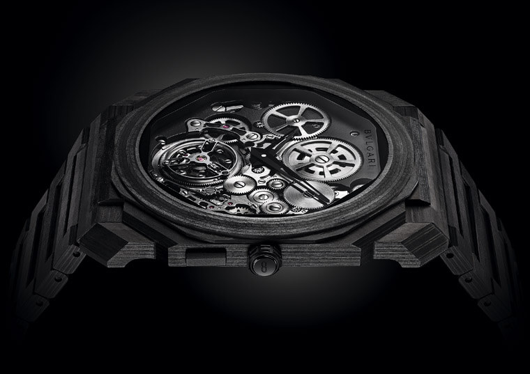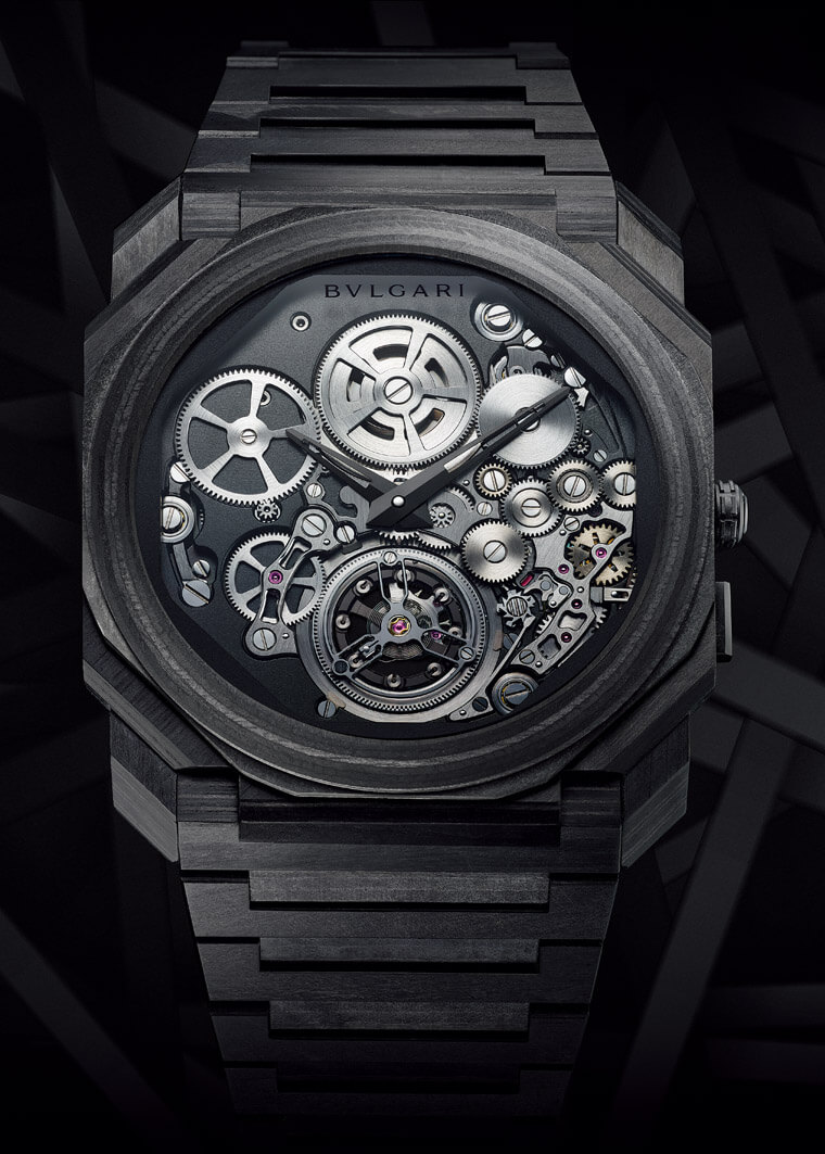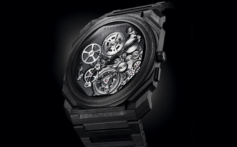 為什麼要花這麼多力氣介紹這兩款品牌在2018年推出的手錶呢?當然是為了替本篇要介紹的主角鋪梗,2019年寶格麗推出一款新作Octo Tourbillon Automatic Carbon碳薄層陀飛輪,從名稱中你大概可以猜得出來,它正是擷取了上面提到兩只錶的特色——碳薄層材質加上超薄自動陀飛輪機芯,讓寶格麗的超薄家族又多了一員生力軍。