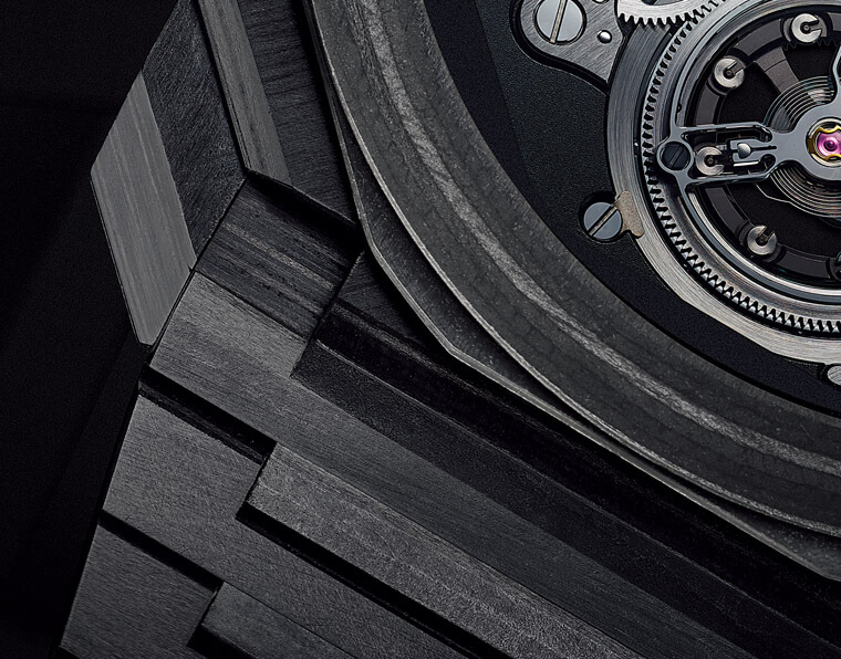 ▲包括錶殼、錶圈及背蓋皆由名為「碳薄層(Carbon Thin Ply, CTP)」的熱固性環氧樹脂所製造,既輕同時也具備相當高的韌性。