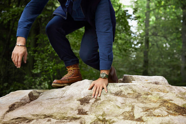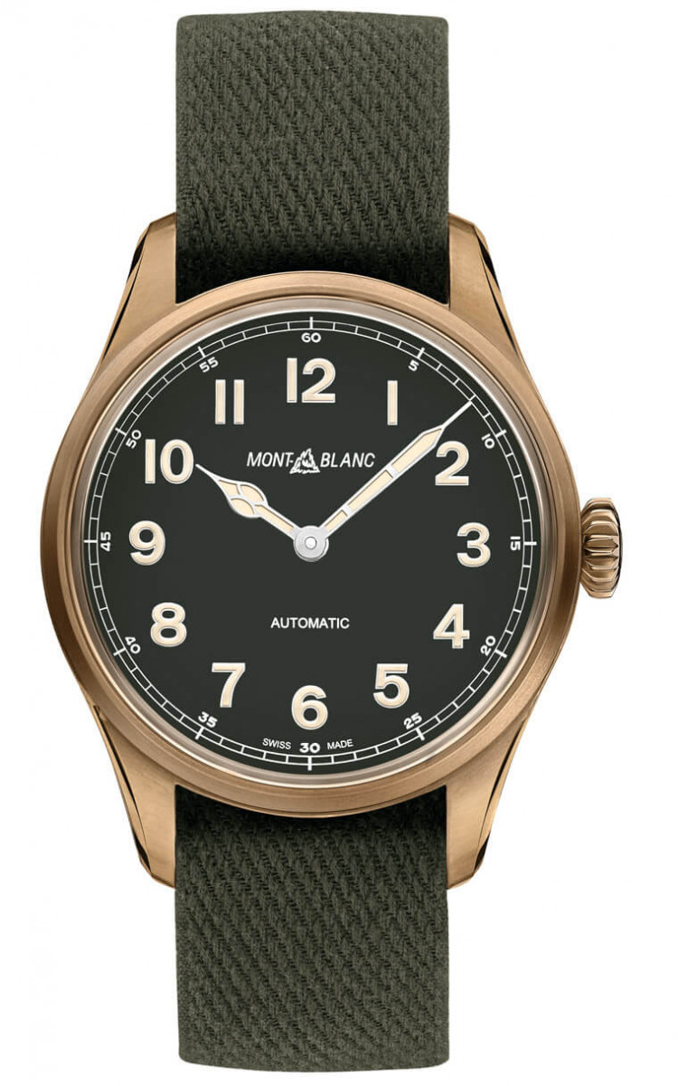 2019年新作結合大自然印象 前兩年的1858系列往往搭配黑面或香檳色面突顯濃重的復古況味,不過2019年此系列卻首度換上了卡其綠色面盤營造新氣象,萬寶龍這回改款的靈感在於輝映系列過往所注重的登山冒險性格,因此選擇綠色最能代表山林等自然景致。1858系列2019年新品的共同特色在於大多數都使用青銅錶殼(除了自動腕錶非限量版有一款不鏽鋼版本)並且限量發行,錶殼交互使用拋光與緞面處理豐富視覺層次感,錶背底蓋考量到部分佩戴者可能會對青銅材質產生過敏反應而改採親膚性較佳的鈦金屬,不過萬寶龍還貼心地鍍上青銅色鍍層,讓腕錶看起來更具一體感。面盤上的重要元素例如時標字體、教堂式指針、米色SuperLumiNova®夜光塗料以及早期的萬寶龍Logo等都很具體地捕捉到復古設計精髓,此外萬寶龍還與法國百年編織廠合作製作綠色編織NATO錶帶,舒適堅韌的錶帶讓人長時間佩戴腕錶也不覺負擔沉重。