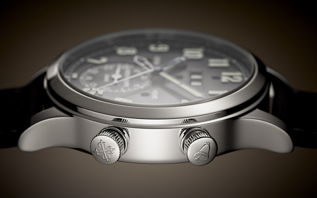 ▲百達翡麗以旗下獨家兩地時間雙時區顯示裝置為本,加入24小時響鬧功能,呈獻最新頂級複雜功能自動 上弦時計,以音錘敲打經典音簧演繹響鬧訊號,錶 身設計流露飛行員兩地時間腕錶風采。